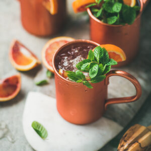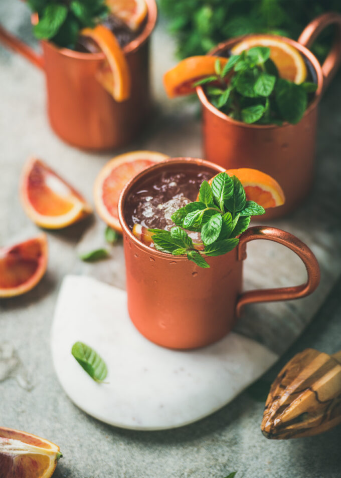 - Garnish with a strip of blood orange peel and a sprig of mint.