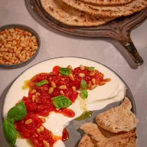 Greek Yogurt with Tomato Jam, Toasted Pine Nuts, Calabrian Chili & Basil Oil